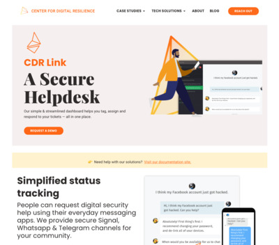 CDR Link is a secure helpdesk. We provide secure Signal, PGP, Whatsapp & Telegram channels for your community. Through our partnership with the Center for Digital Resilience, Link has become the gold standard for secure and private help desk systems for human rights and humanitarian use cases.